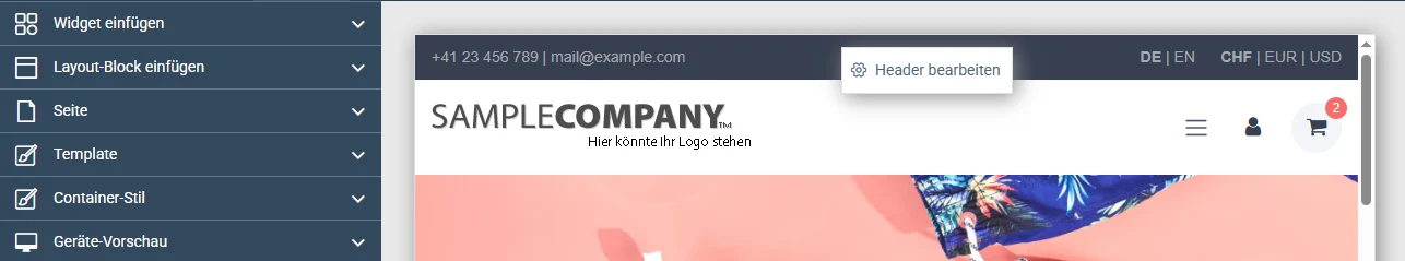 Im Bearbeitungsmenü des Headers können Sie abhängig vom eingesetzten Header unterschiedliche Einstellungen vornehmen. Nicht alle Optionen sind bei jeder Headervariante verfügbar.