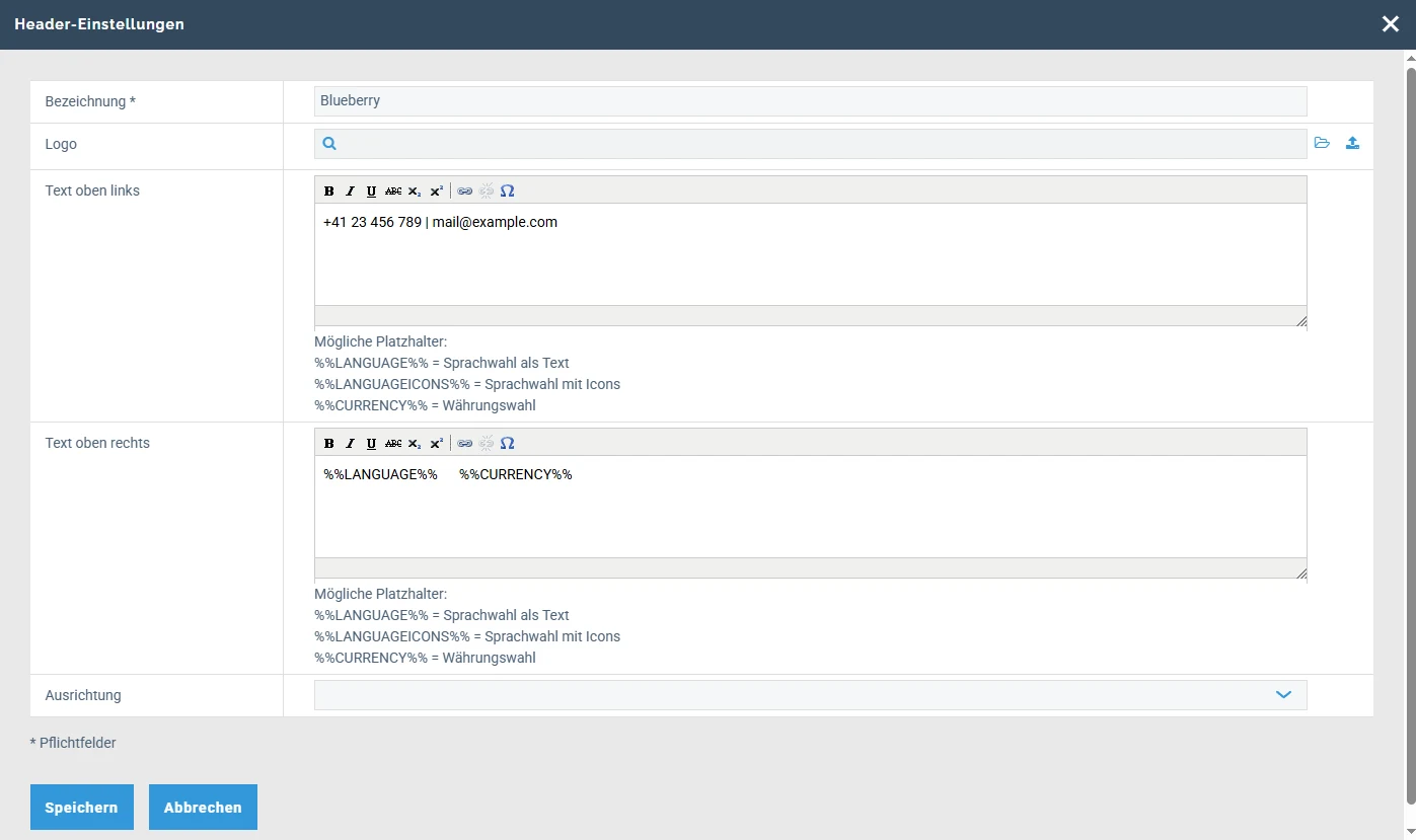 - Sofern die entsprechenden Funktionen aktiv sind, können in den Texten bestimmte Platzhalter eingesetzt werden. Die verfügbaren Platzhalter werden unterhalb des Eingabefeldes aufgelistet.