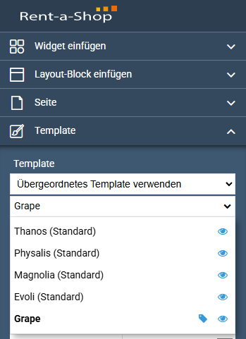 Wählen Sie im zweiten Feld das gewünschte Template aus. Hier werden stets alle Verfügbaren Standard-Templates aufgelistet, sowie die von Ihnen individualisierten.