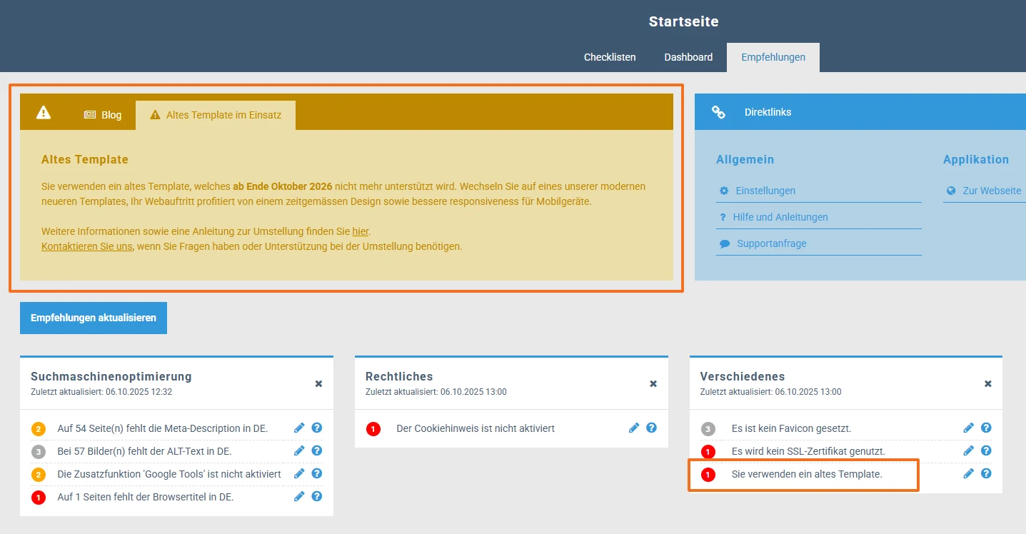Bitte prüfen Sie im Dashboard, ob Ihre Seite betroffen ist. Dort wird eine entsprechende Meldung angezeigt.