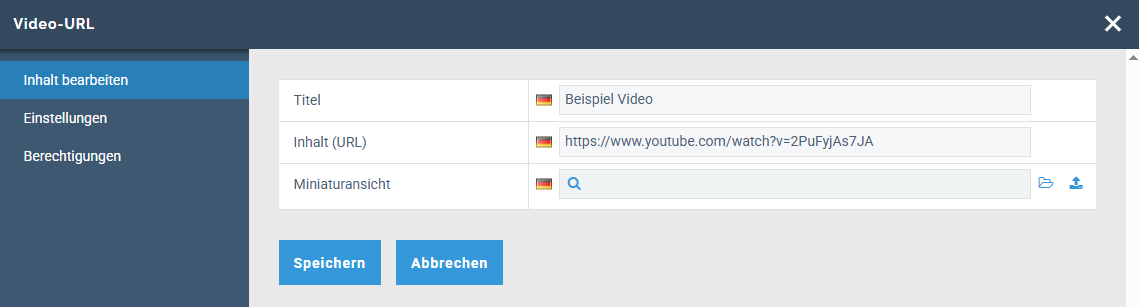 Inhalt (URL): Geben Sie die URL des gewünschten Videos ein. Sie können lediglich URLs von Youtube und Vimeo hinterlegen.